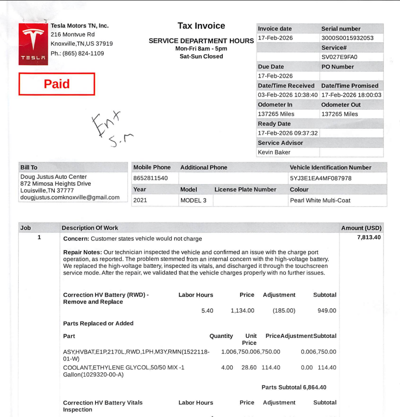 High Voltage battery was replaced through TESLA! (Reciepts for service are in pictures)